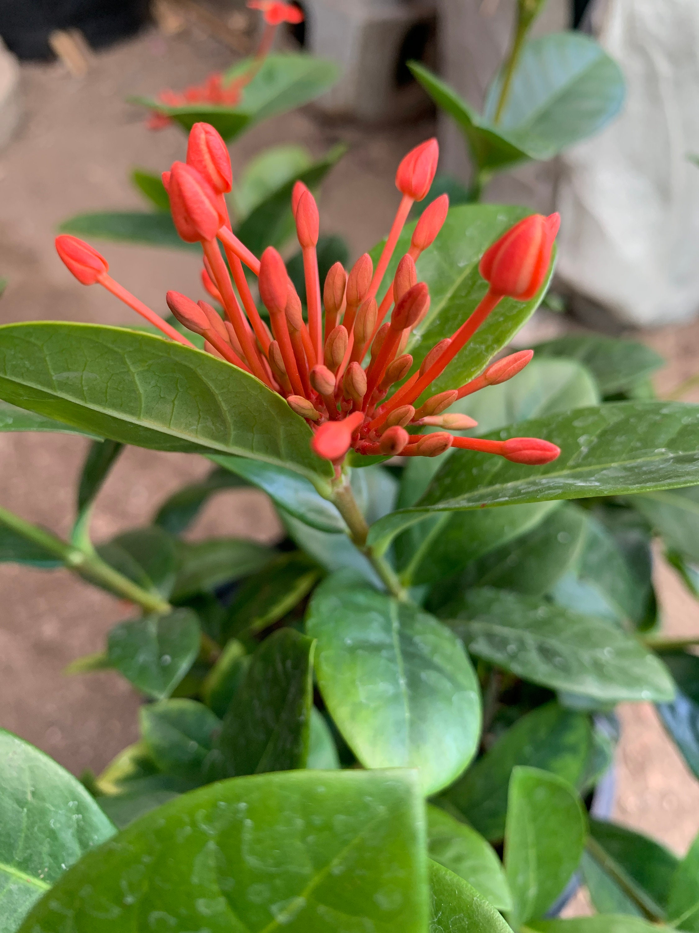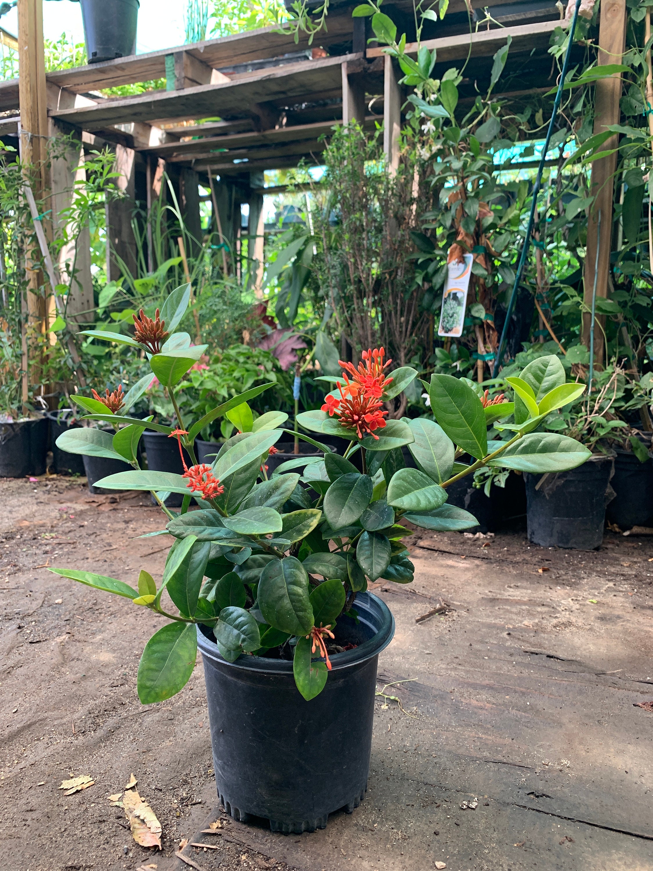 Showy tropical shrub with colorful, star-shaped red flowers in round clusters at branch ends blooming all summer.