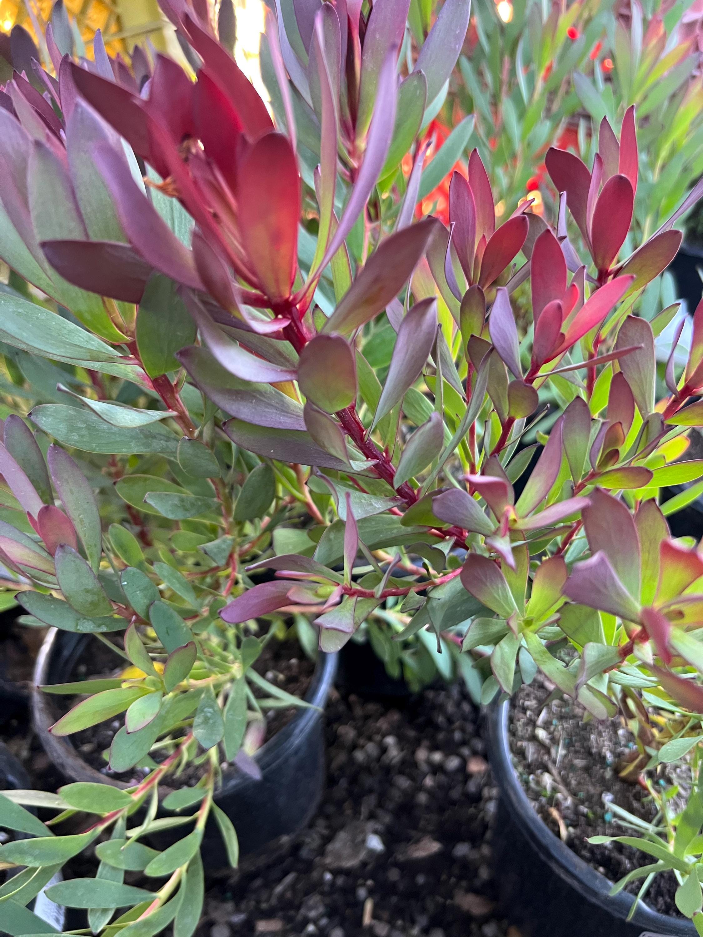 Leucadendron 'Hawaii Magic' is a compact, evergreen shrub known for its colorful, season-changing foliage and upright, bushy form.