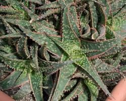 Coloration: It features deep green, lance-shaped leaves with vibrant red or coral-pink trim and raised, tooth-like red bumps (tubercles) on the surface.