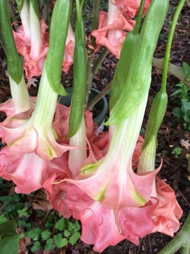 Angel Trumpet. Double large pink-red flowers with white throat.