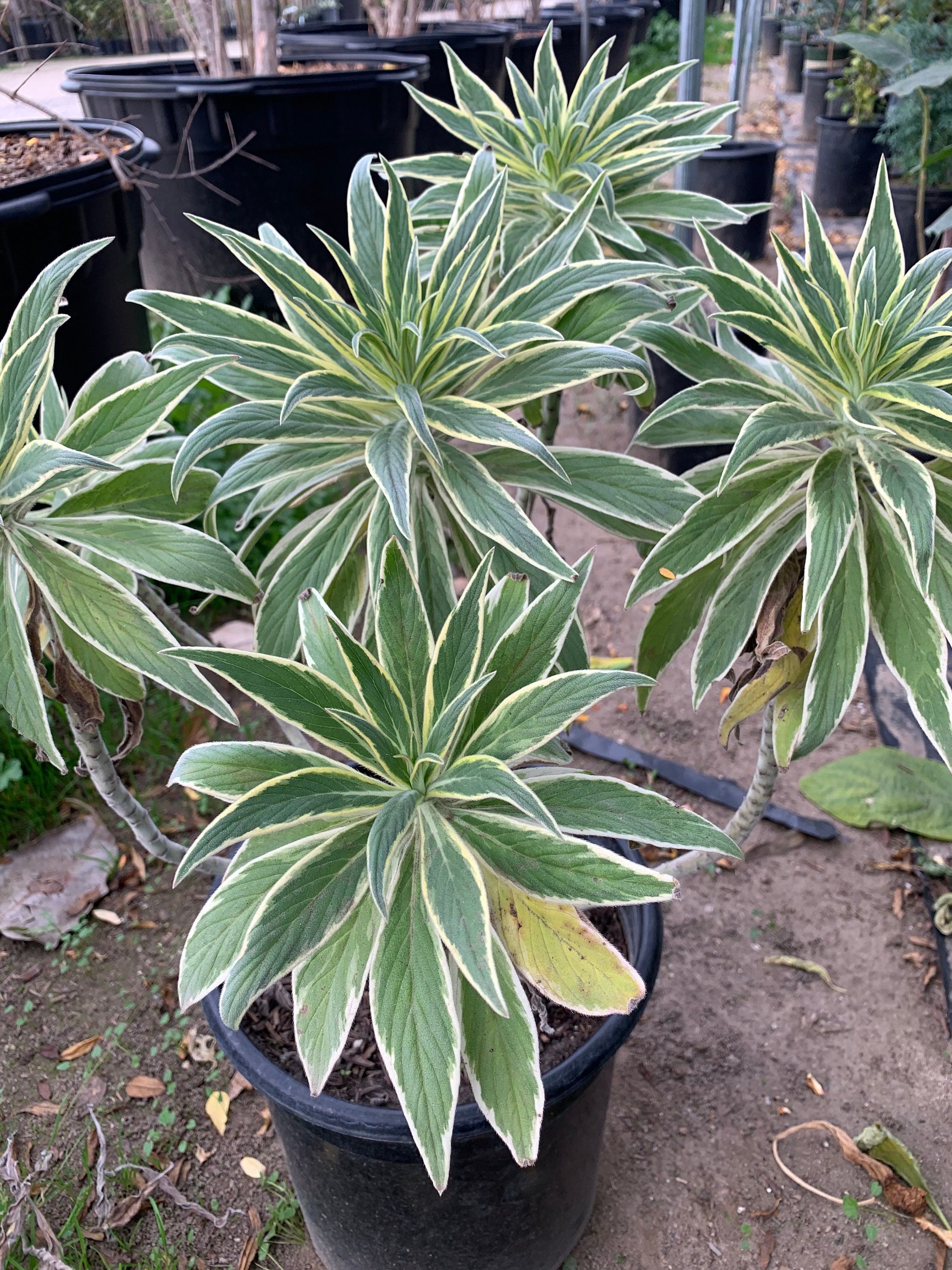 Bold and striking variegated leaves on a specimen. Lavender blue flower in late spring.